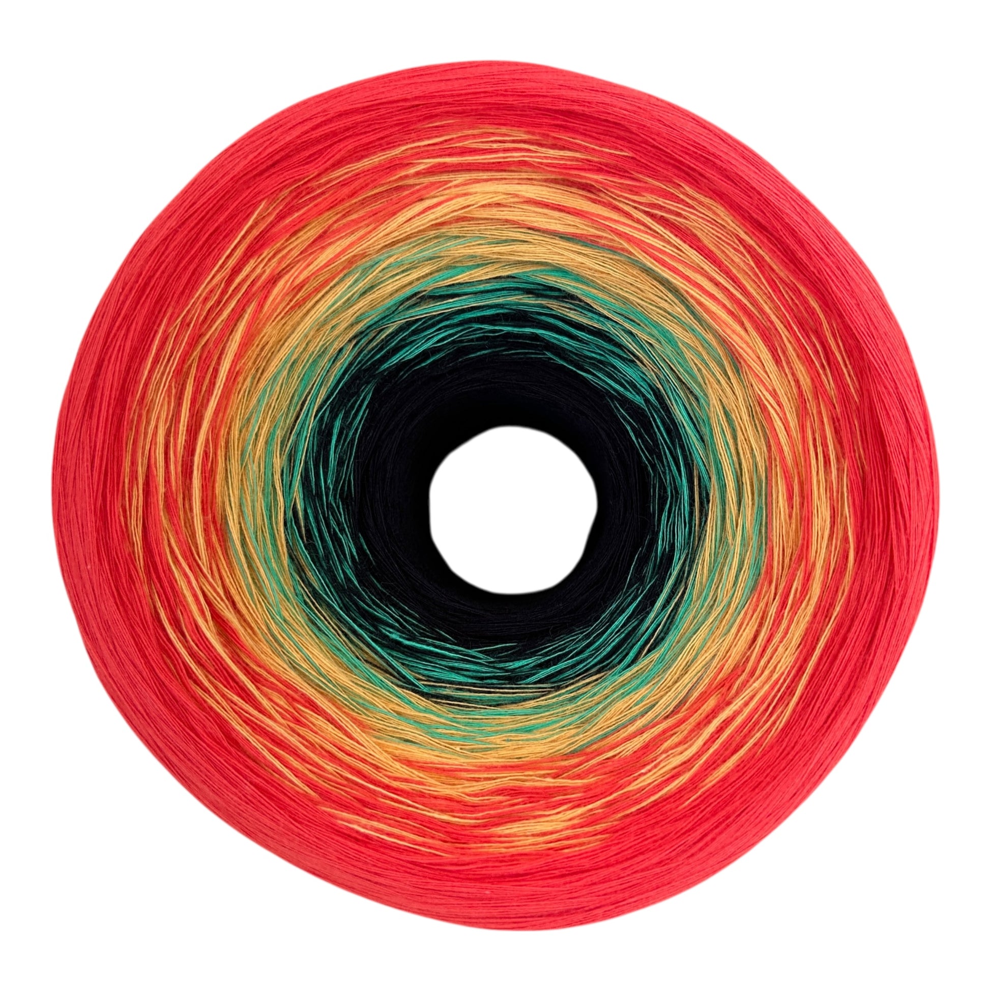 The yarn consist of 8 strands of cotton thread hand wound together and has long transitions for amazing color effect. It can be worked from inside or outside. The Vibrant gradients are created by the different strand colors ties together using tiny knots that do not need extra work to be used in your project.